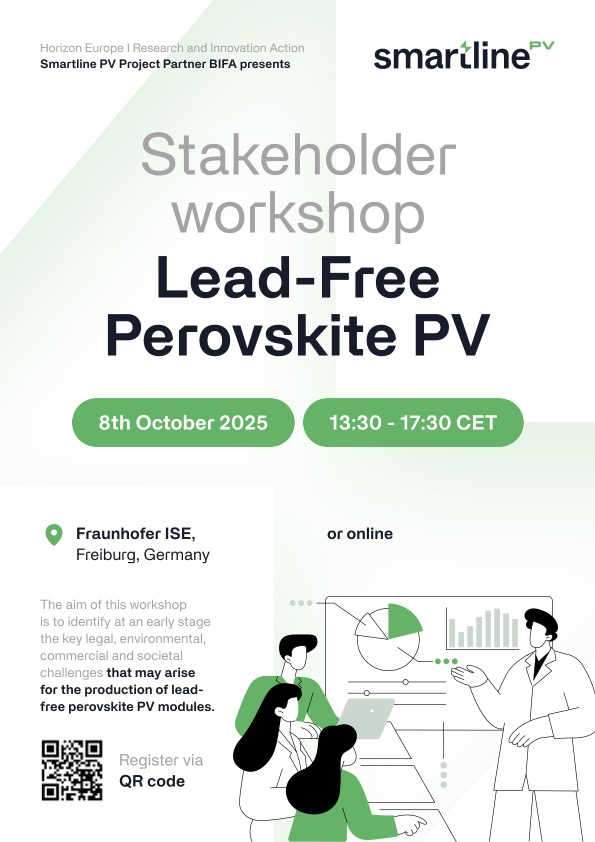 October 7th, 2025 On October 7th, the first Stakeholder Workshop within the Horizon Europe project Smartline PV took place at the Fraunhofer Institute for Solar Energy Systems (Fraunhofer ISE) in Freiburg, Germany. The event brought together experts from research, industry, certification bodies, and policy to discuss the future of sustainable, lead-free perovskite photovoltaics in Europe. Responsible innovation and early assessment Organized by the bifa Umweltinstitut GmbH team — Markus […]